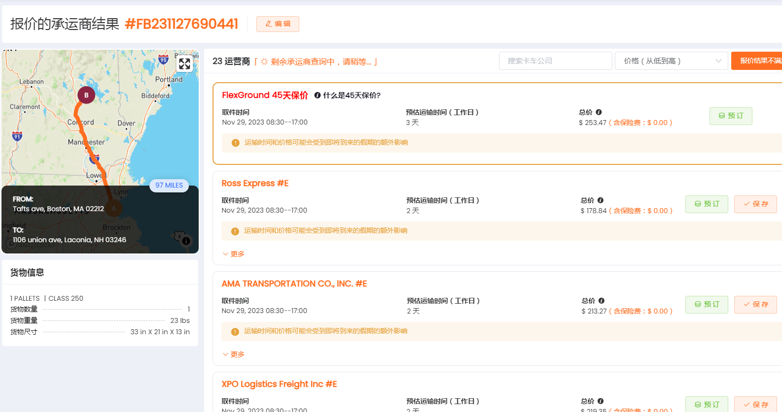 了解更多如果你正在寻找一个能查询美国卡车派送报价的平台,那么可以试试环至美,环至美卡车自助平台链接美国本土上万家卡车公司,覆盖全美48州,只要你在美国,我们都能帮你把货送到门,下面