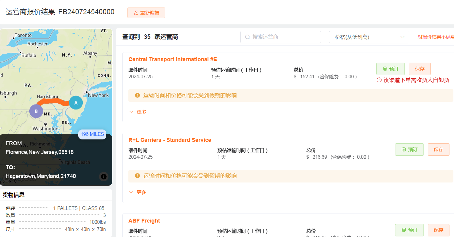 系统会根据我们填写的信息匹配出能够承运的卡车运营商,我们从界面上可以看到两地之间的距离、各家卡车公司的预估时间和报价。选择自己想要的卡车公司点击预订进行下单。